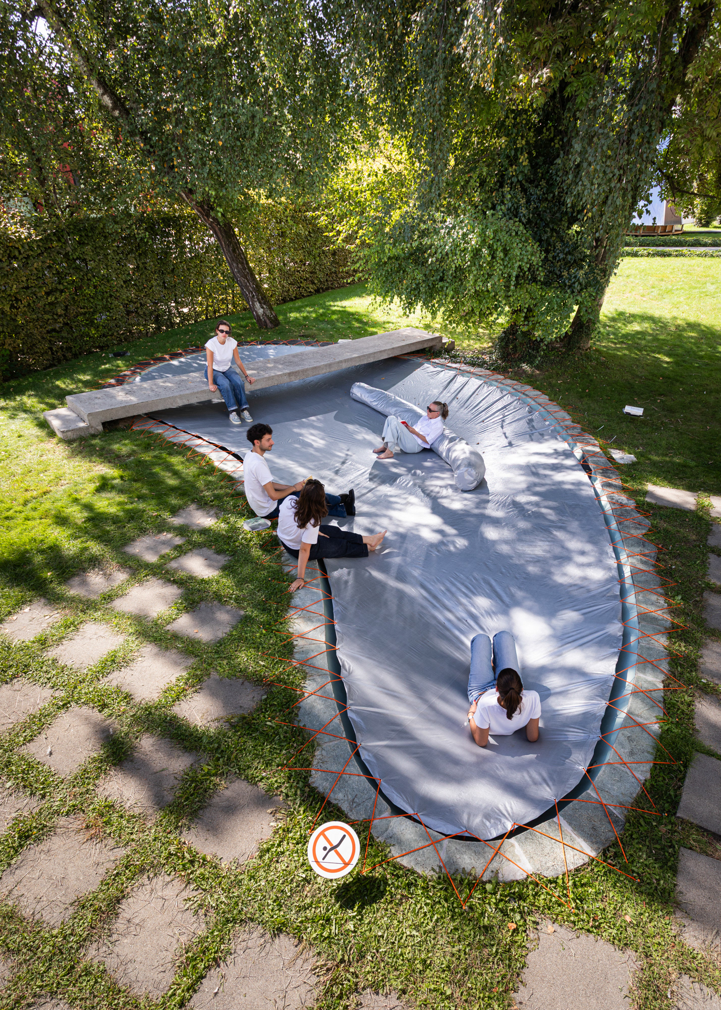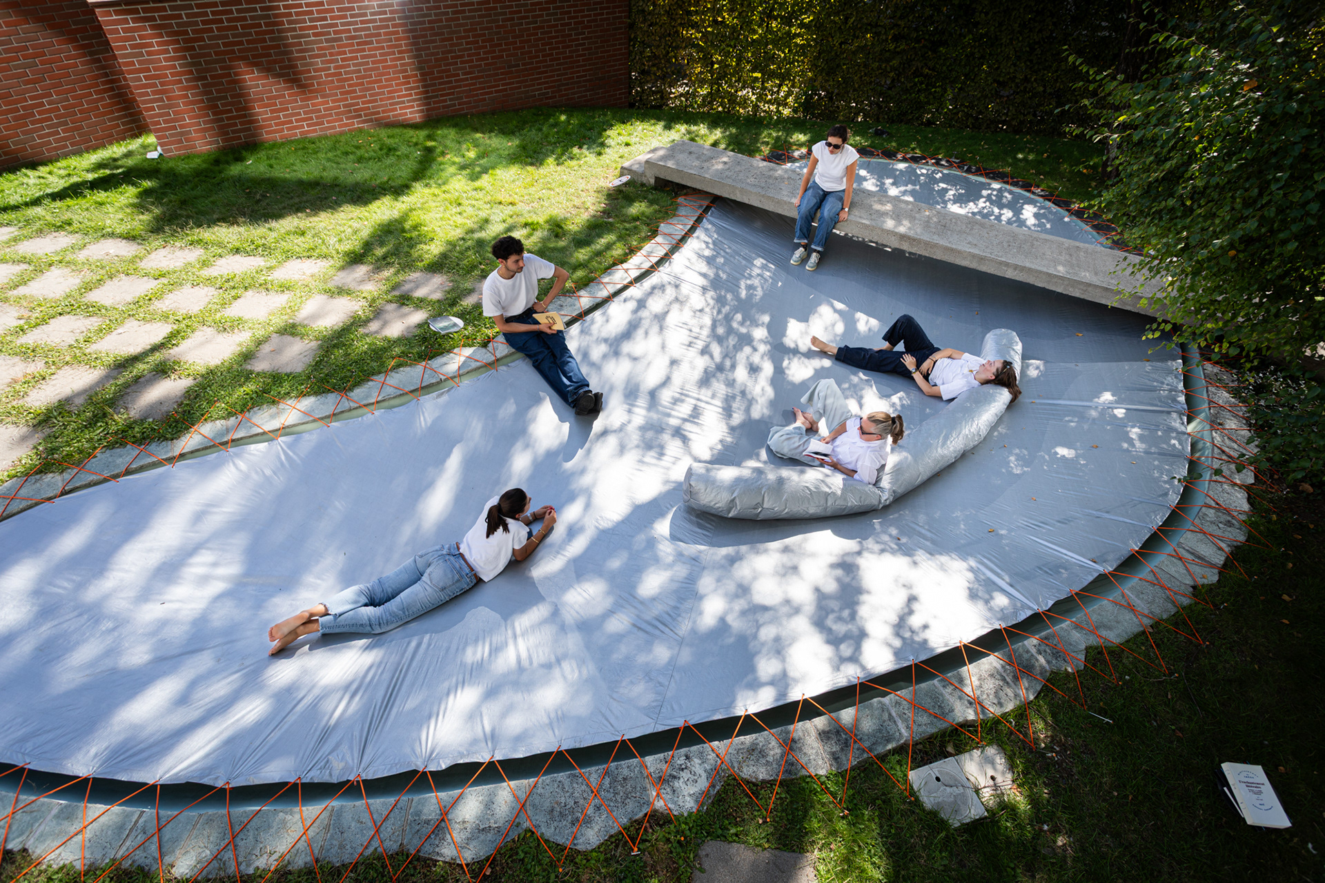 Pour cet atelier « Care for your HEAD », nous avons choisi de nous installer près du bâtiment Georges Addor. Construit en 1955, il est aujourd'hui classé monument historique. Au pied de ce bâtiment se trouve une piscine qui s'inspire directement de l'architecture tropicale, rendue célèbre par des architectes brésiliens tels qu'Oscar Niemeyer, par exemple. Cette piscine n'est plus utilisée depuis des années pour des raisons de normes et de sécurité. Cet espace, caché par des haies, est aujourd'hui un espace calme mais inutilisé. Notre projet consiste à réactiver cet espace en tirant parti de la forme creuse de la piscine. Plutôt que de la considérer comme un vide, nous l'utilisons comme un support : un générateur de confort. Nous avons donc installé une couverture en plastique tendue au-dessus de la piscine, grâce à un système de cordes et de sardines. Afin de mieux s'ancrer dans le lieu choisi, l'idée était ensuite de créer une extension de la bibliothèque juste à côté de nous. C'est un endroit où l'on peut lire, se détendre, se réunir ou au contraire s'isoler un instant du rythme de l'école. Il peut être utilisé pendant les journées agréables comme celle-ci. Notre installation transforme ainsi un espace inutilisé en un lieu de confort, qui met en valeur le site existant tout en créant un lien direct avec la bibliothèque et la vie scolaire.